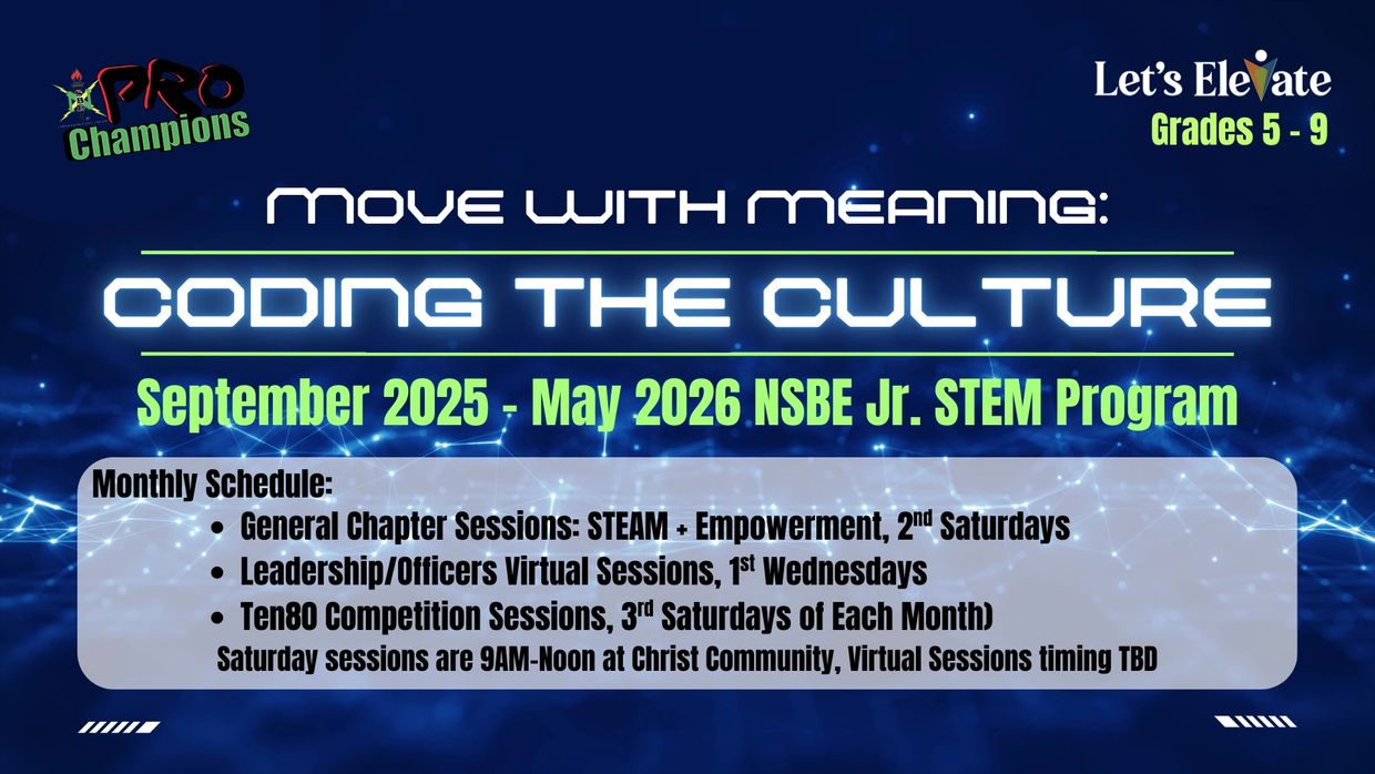The primary goal of NSBE Jr. is to encourage students in grades K-12 to develop interest in science, technology, engineering, and mathematics (STEM). NSBE Jr. focuses on enhancing the education received by African-American and other pre-college students underrepresented in STEM, as well as influencing these students to become tomorrow's corporate executives, entrepreneurs, and other leaders. Let's Elevate's PRO Champions NSBE Jr. chapter is part of this great initiative!